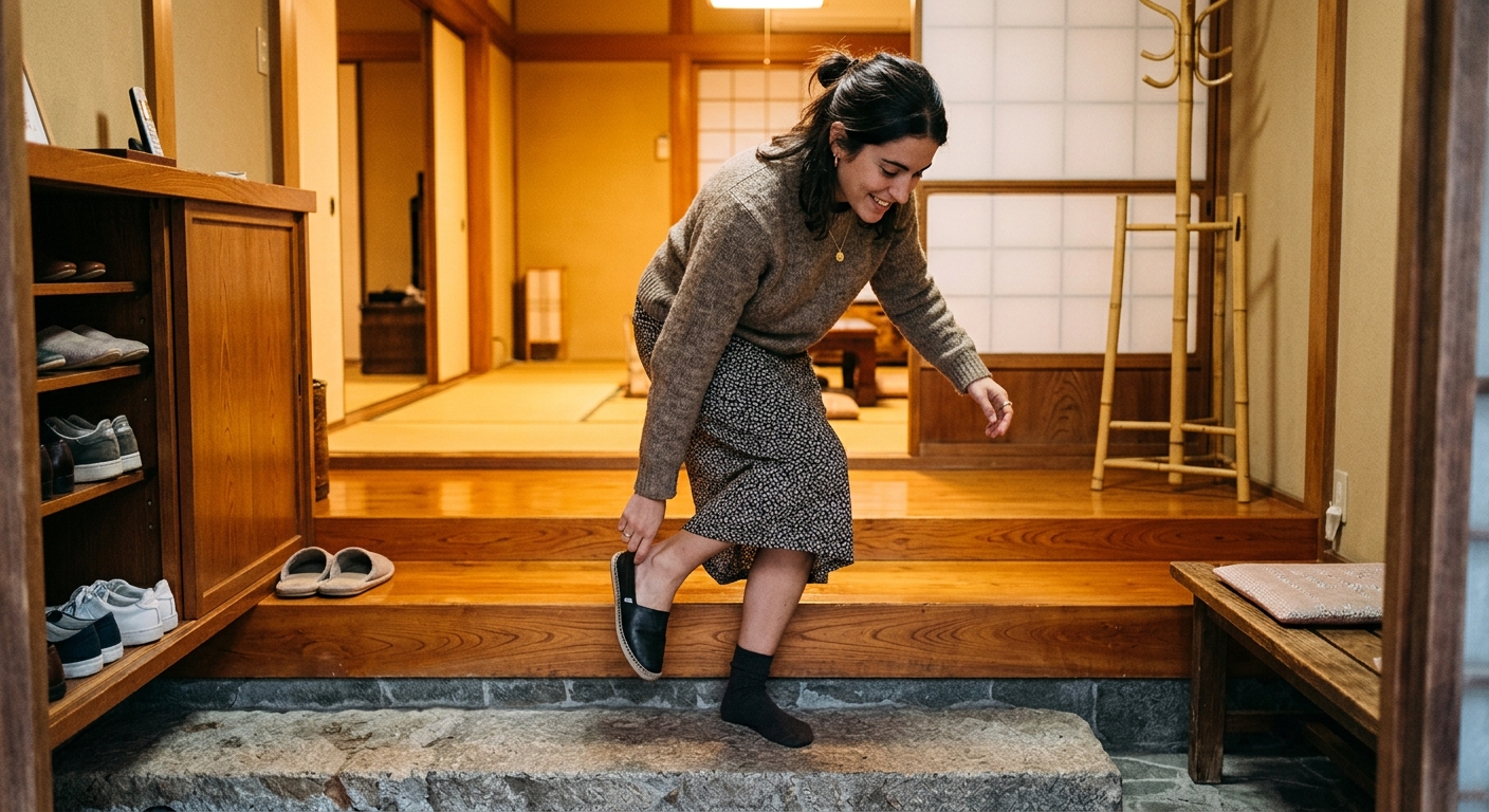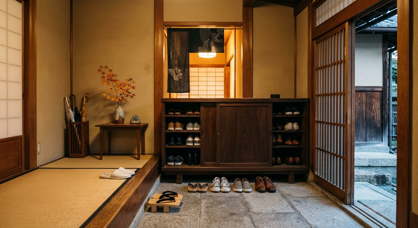Los zapatos se quitan siempre al entrar en una casa. El 「玄関」(genkan, entrada) tiene un desnivel llamado 「上がり框」(agari kamachi) que marca la frontera entre el exterior y el interior. Al cruzar esa línea, el calzado se deja atrás. Esta costumbre se extiende a los ryokan (posadas tradicionales), las escuelas, ciertos restaurantes con tatami, y el interior de templos y santuarios. Las señales son claras: si ves un desnivel, zapatillas dispuestas o un zapatero, es momento de descalzarse.