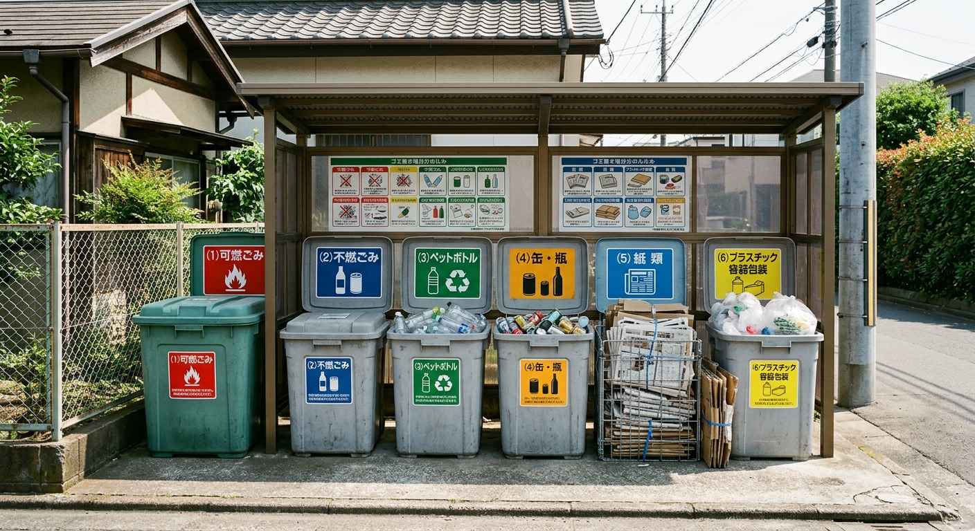 Las categorías básicas incluyen: 「燃えるゴミ」(moeru gomi, residuos combustibles), como restos de comida, papel y tela; 「燃えないゴミ」(moenai gomi, residuos no combustibles), como metal, cerámica y cristal; 「資源ゴミ」(shigen gomi, residuos reciclables), como botellas PET, latas y frascos de vidrio; y 「粗大ゴミ」(sodai gomi, residuos voluminosos), como muebles grandes, que requieren reserva previa y un coste adicional.