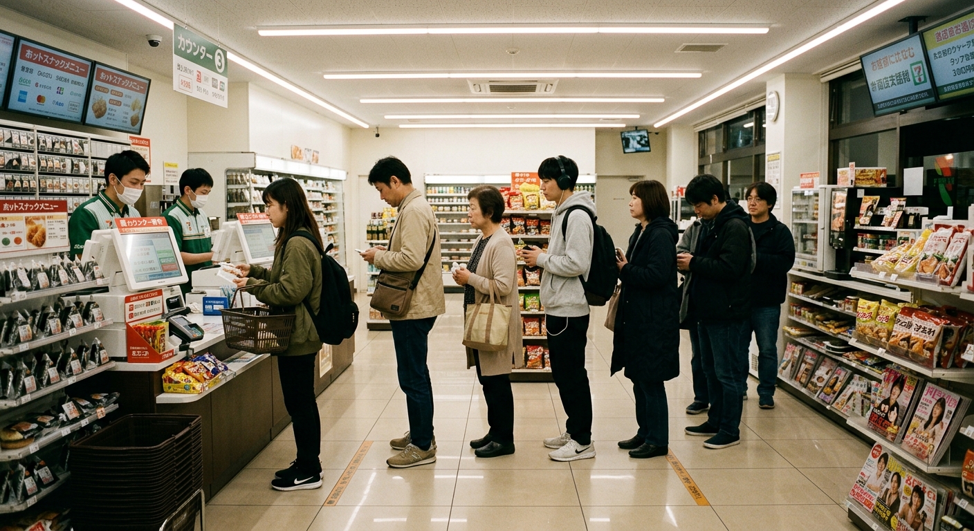 En los comercios, la fila adquiere formas variadas. Los restaurantes populares generan colas que pueden extenderse por la acera; algunos establecimientos usan un sistema de lista donde escribes tu nombre y el número de comensales en una libreta junto a la entrada. En supermercados y konbinis, el sistema más habitual es la fila tipo horquilla: una sola cola que alimenta a todos los cajeros, y el primero en la fila avanza al siguiente cajero libre. Ante los cajeros automáticos, la fila mantiene una distancia extra — un metro o más — para proteger la privacidad de quien está operando.