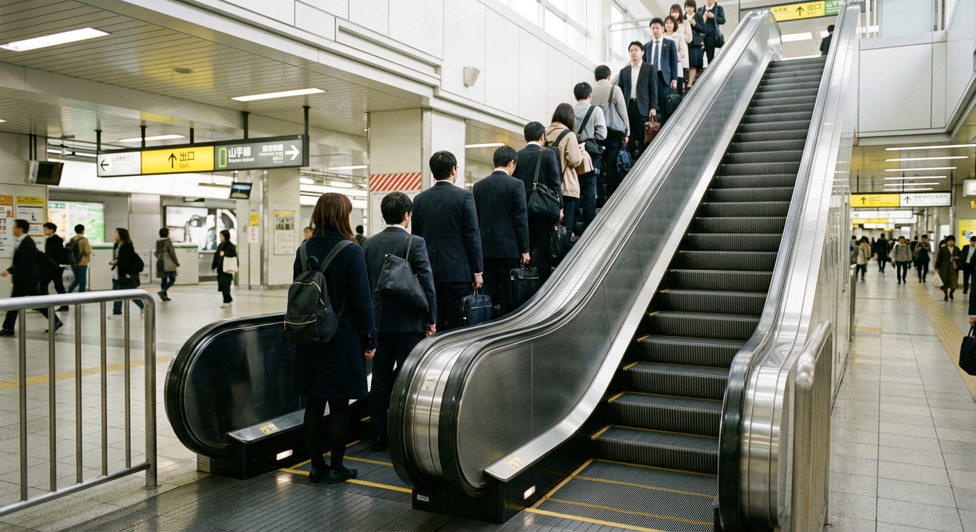 Las escaleras mecánicas en Japón funcionan con una norma no escrita que confunde a casi todos los visitantes: hay que dejar un lado libre para quienes tienen prisa.