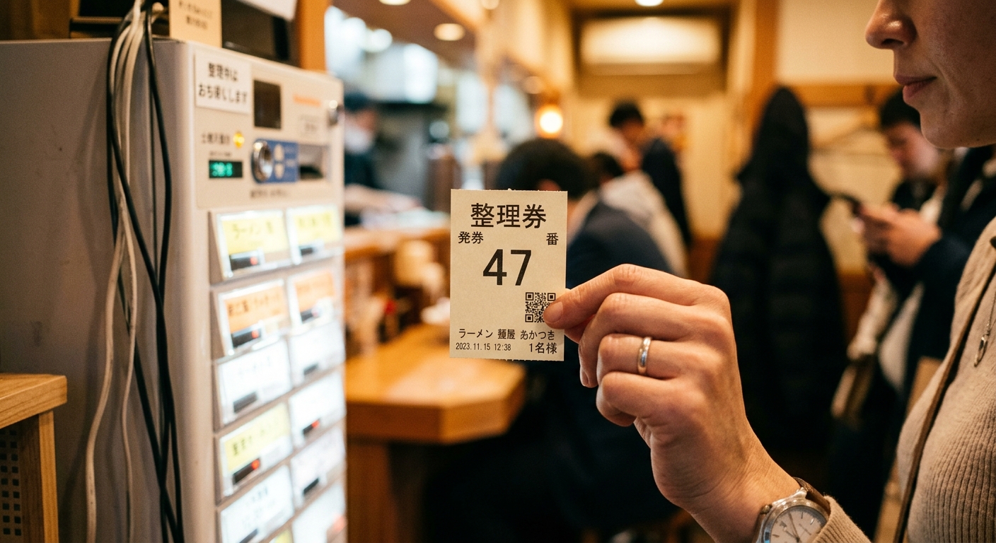 Las filas de los restaurantes célebres. Los mejores restaurantes de ramen, las pastelerías artesanales y las tiendas de pan de autor generan colas que son, en sí mismas, una forma de validación social. En Japón, 「行列のできる店」(gyōretsu no dekiru mise, "la tienda que genera cola") es sinónimo de calidad. Si hay fila, es porque vale la pena. Algunos establecimientos populares de Tokio tienen esperas habituales de una a dos horas. Para gestionar la demanda, muchos utilizan un sistema de 「整理券」(seiriken, tickets numerados): llegas por la mañana, recibes un número y vuelves a la hora indicada.