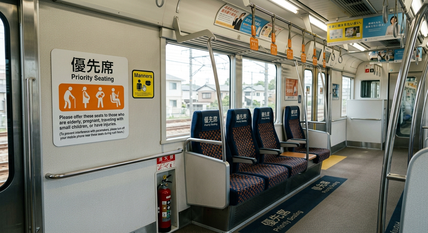 Los 「優先席」(yūsenseki, asientos prioritarios) están claramente señalizados en todos los vagones, generalmente con un color diferente y carteles que indican a quién están destinados: personas mayores, embarazadas, personas con discapacidad, pasajeros con niños pequeños y personas con discapacidades no visibles. ¿Se puede sentar uno si están vacíos? Las opiniones difieren. Algunos japoneses los evitan por principio; otros se sientan pero se mantienen alerta para ceder el asiento en cuanto alguien lo necesite. Si decides sentarte, no te quedes dormido ni te sumerjas en el teléfono: debes estar preparado para levantarte de inmediato.