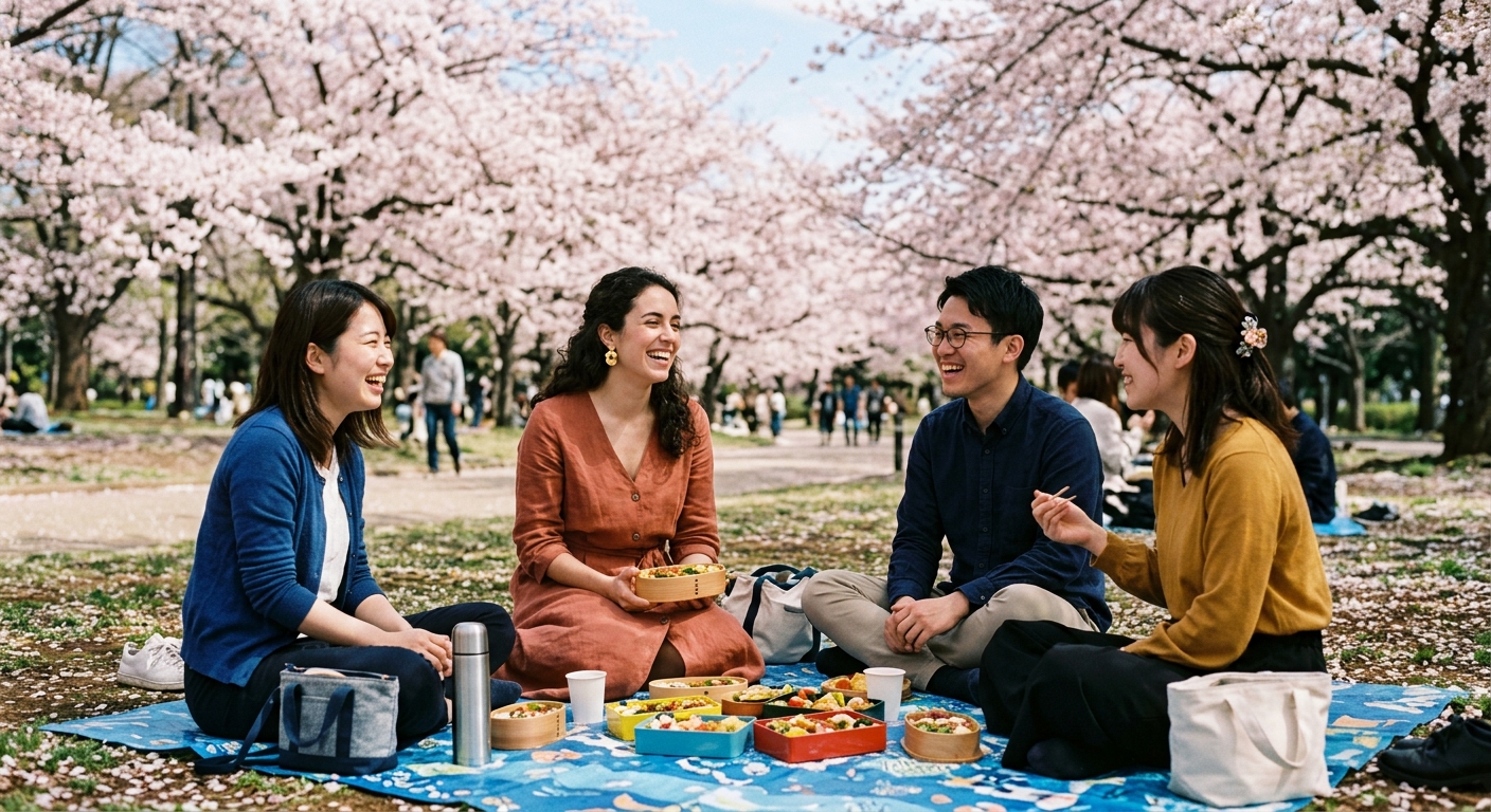 Imagina esto: un parque en Tokio, finales de marzo. Cientos de lonas azules cubren el suelo bajo una bóveda de pétalos rosados. Grupos de amigos, familias y compañeros de trabajo se sientan sobre ellas con cajas de bentō, latas de cerveza y risas que resuenan entre los troncos. Los pétalos de cerezo caen como una nevada en cámara lenta. Estos son los mismos japoneses que en el tren no emiten un solo sonido — y aquí están, brindando y cantando bajo las flores.