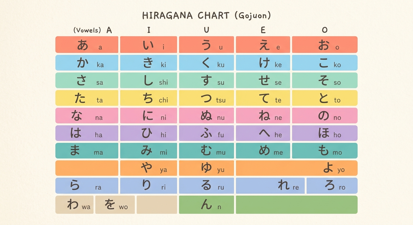 En el aprendizaje del hiragana, entender la estructura del gojūon es como la diferencia entre explorar una ciudad nueva sin mapa y explorarla con un mapa detallado. Comprender la estructura hace el aprendizaje sistemático y mejora enormemente la eficiencia.