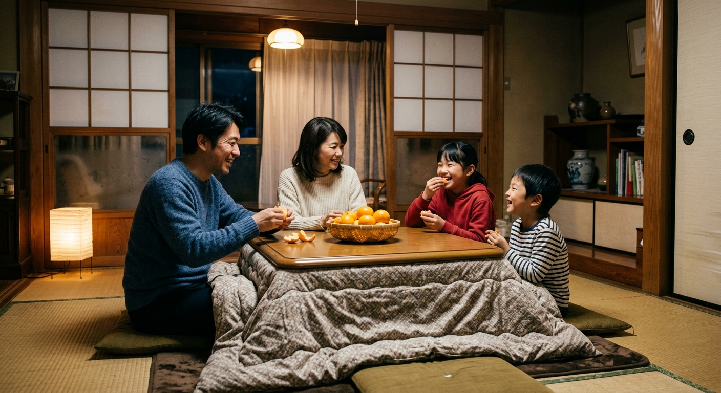 Si has visto anime japonés, conoces esta escena. Doraemon, Sazae-san, Shin-chan — familias reunidas alrededor del kotatsu comiendo mandarinas, viendo la televisión, quedándose dormidas. Es la imagen arquetípica del invierno japonés. Pero el kotatsu es solo el comienzo.