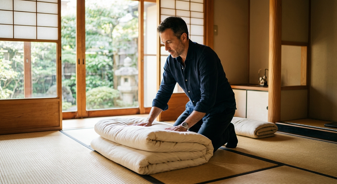 Cuando un occidental oye "futon", probablemente imagina ese sofá-cama de estructura metálica popular en los años 90. Eso no es un futon japonés. El verdadero 布団 (futon) es mucho más simple — y más sofisticado.