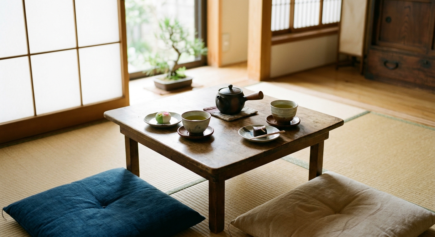 Filosofía de vida al nivel del suelo: La cultura japonesa tradicional se desarrolla cerca del suelo — sentarse en zabuton, comer en mesas bajas, dormir en futon. Hay una coherencia estética y práctica en esta vida a baja altura.