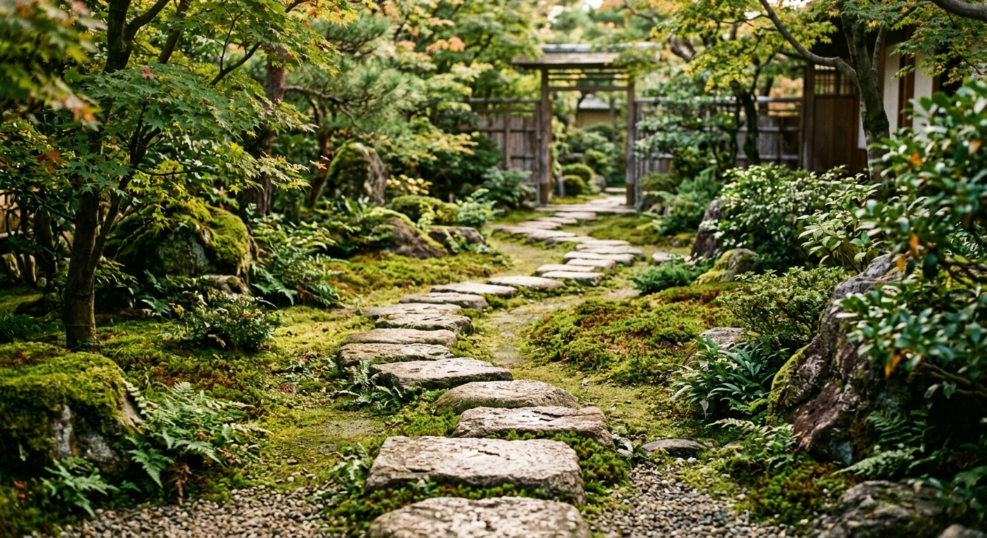 Incluso los 「飛び石」(tobi-ishi, piedras de paso) que atraviesan un jardín son una lección de ma. El espacio entre piedra y piedra no es un obstáculo: es lo que crea el ritmo del paseo. Cada paso se vuelve deliberado, cada transición se convierte en un instante de atención. El vacío entre las piedras transforma un simple desplazamiento en una experiencia meditativa.