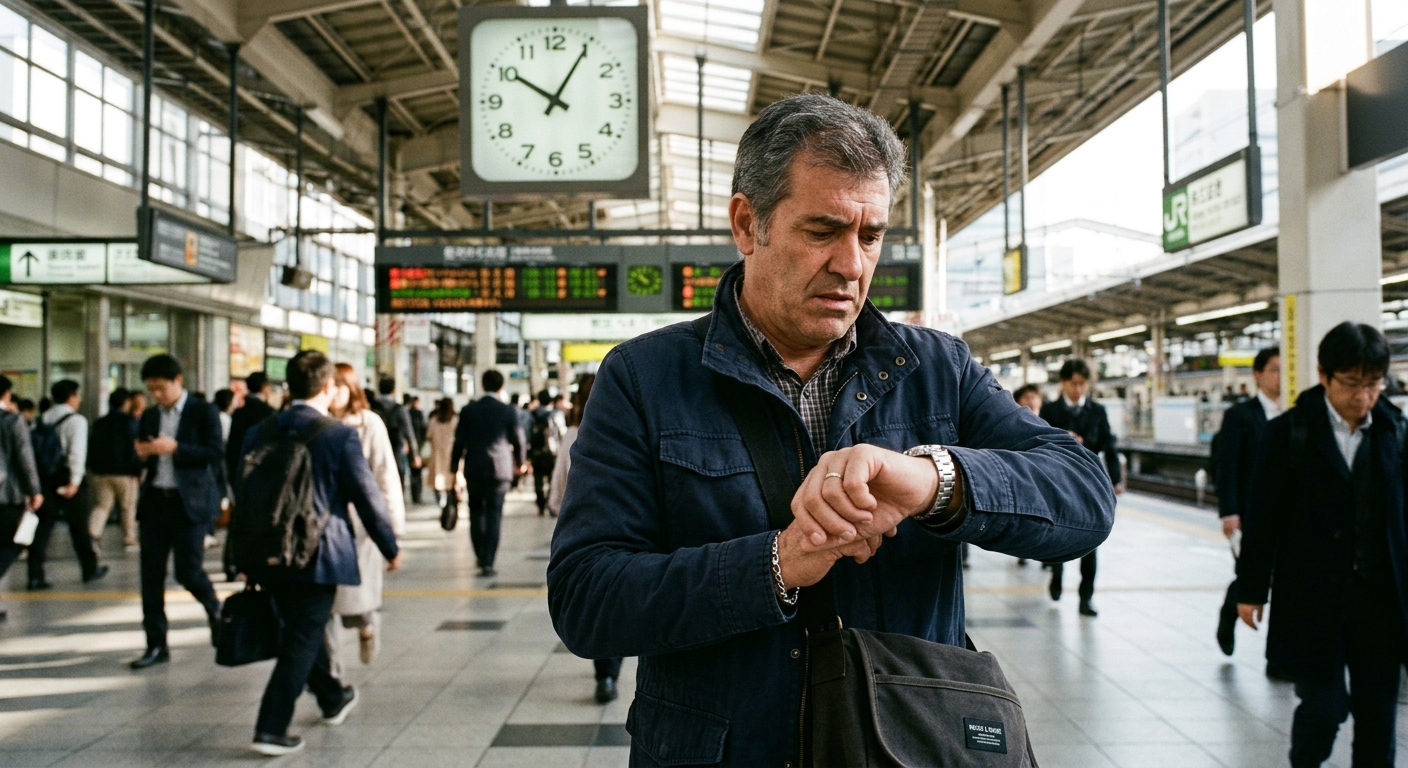 Para el visitante hispanohablante, esa frase contiene una pequeña revolución. Tu cultura entiende la puntualidad como una virtud relativa, modulable según el contexto: para una cita formal, sí; para una comida con amigos, "media hora tarde" puede ser lo normal. En Japón, en cambio, la puntualidad opera bajo otra lógica. No es flexible. No es relativa. Es absoluta — y se mide en segundos.