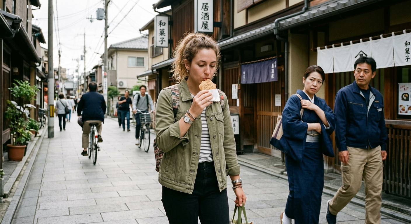 En gran parte del mundo, comer un bocadillo mientras caminas por la calle es completamente normal. En Japón, es gyōgi ga warui (行儀が悪い) — "falta de modales".