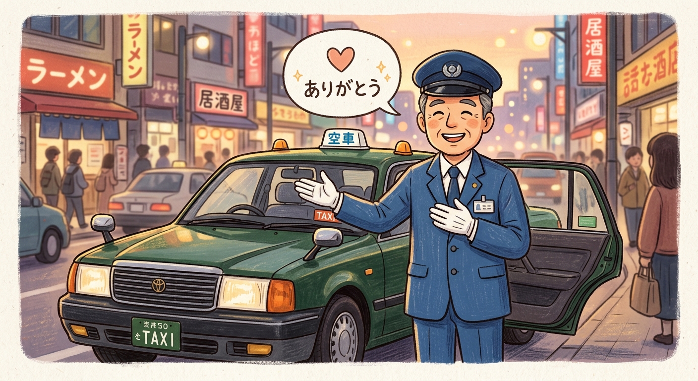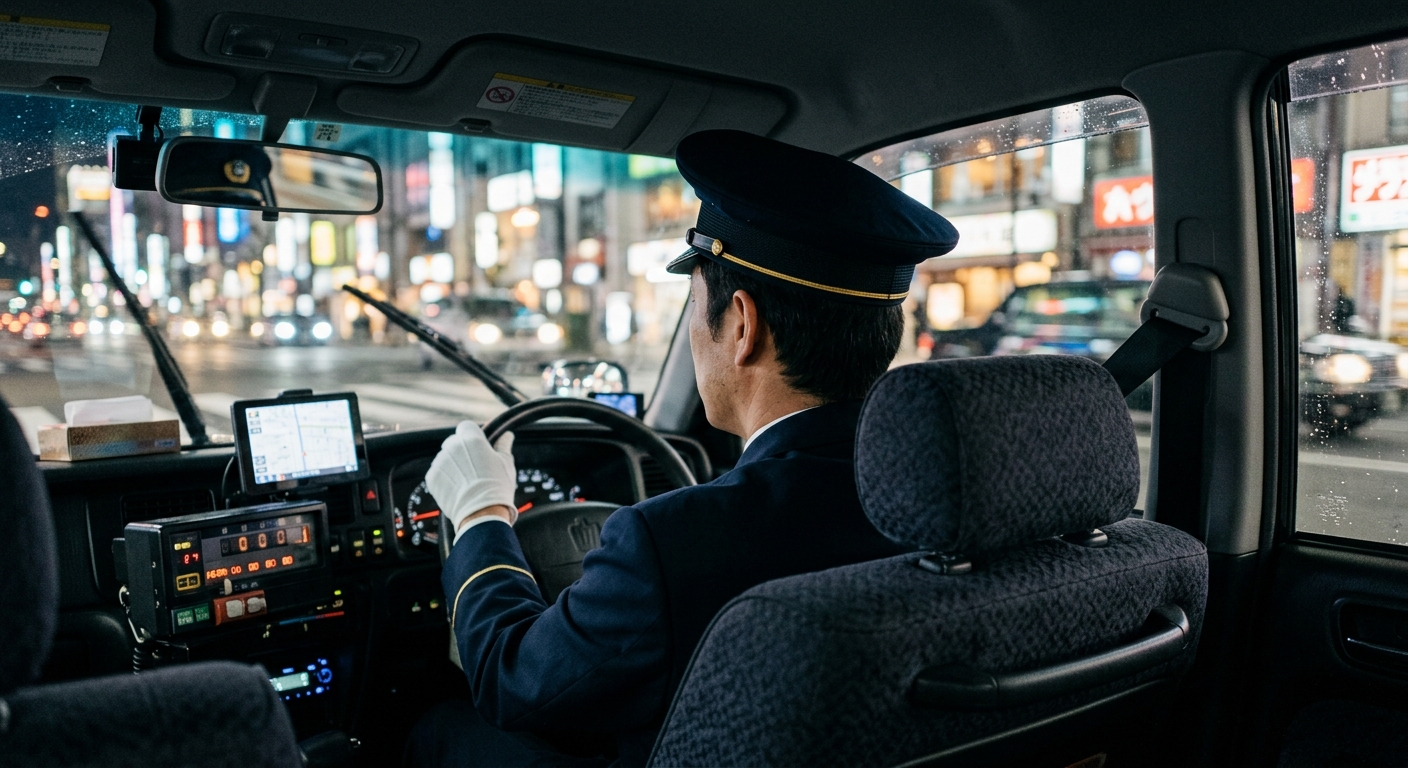 El conductor. Los taxistas japoneses son profesionales en el sentido más literal de la palabra. Los guantes blancos simbolizan limpieza y respeto. Muchos llevan uniforme completo con gorra. La interacción con el pasajero sigue un guion cortés: 「いらっしゃいませ」(irasshaimase, "bienvenido") al subir, 「ありがとうございました」(arigatō gozaimashita, "muchas gracias") al bajar. El trato es en keigo (lenguaje honorífico), independientemente de la apariencia del pasajero.